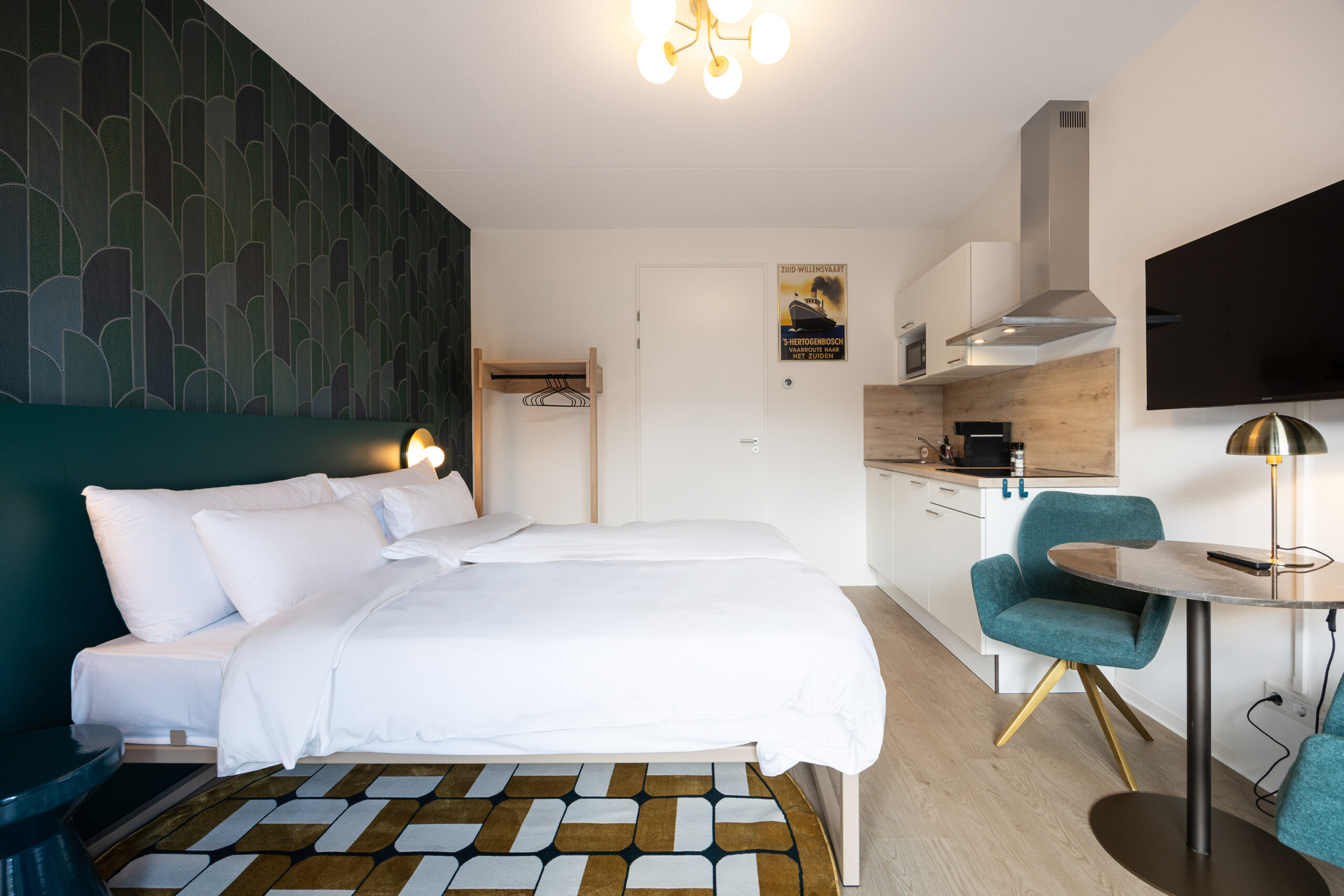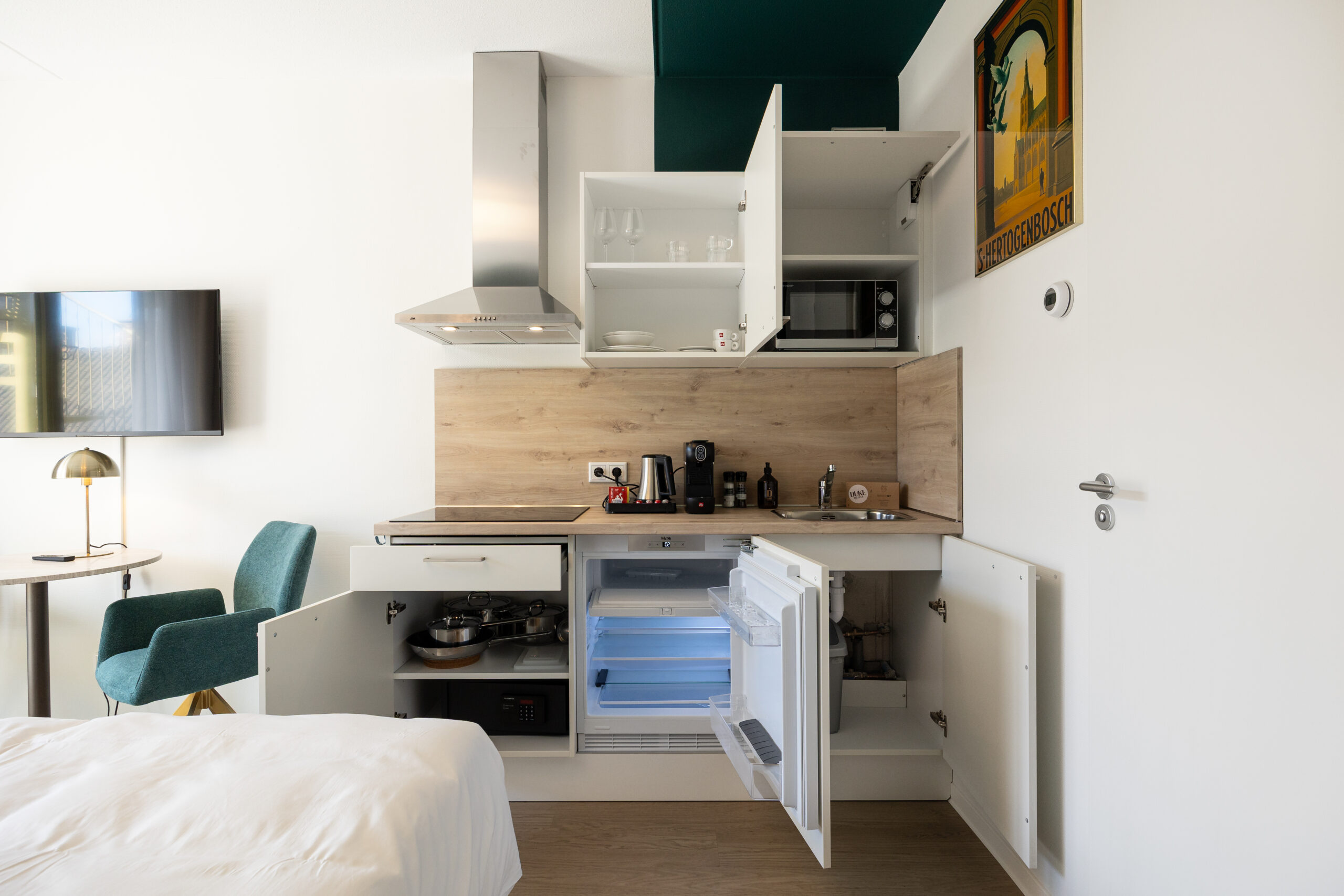 - Compleet uitgeruste kitchenette met vier-pits inductiekookplaat, afzuigkap, koelkast, spoelbak, magnetron, kookgerei en opbergruimte