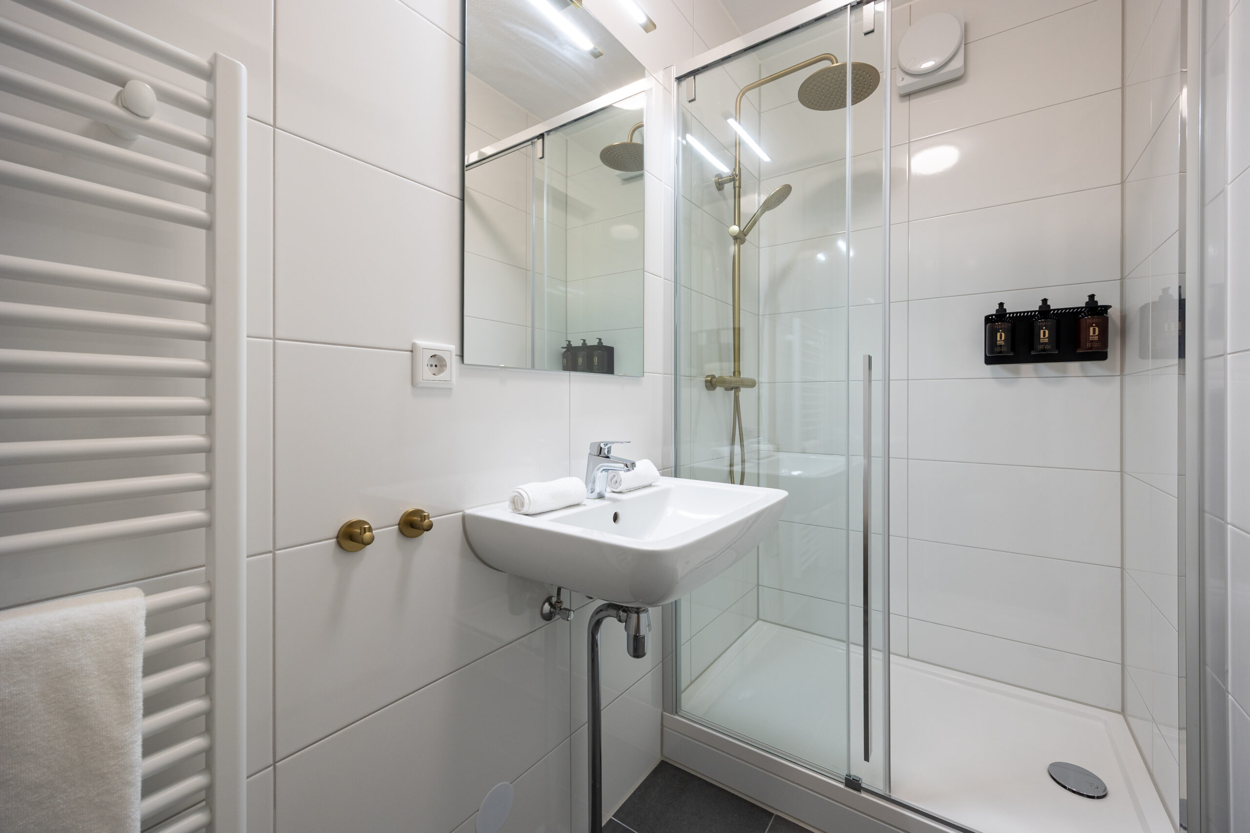 - Badkamer met toilet, wastafel met verwarmde spiegel, douchecabine met regen- en handdouche