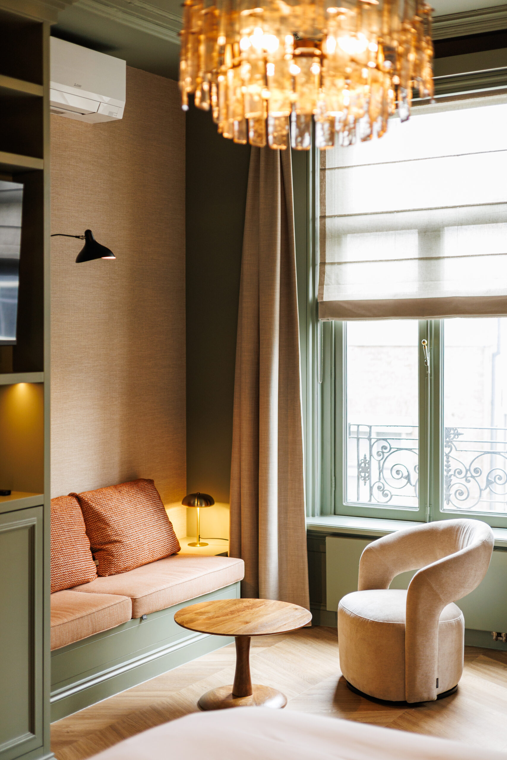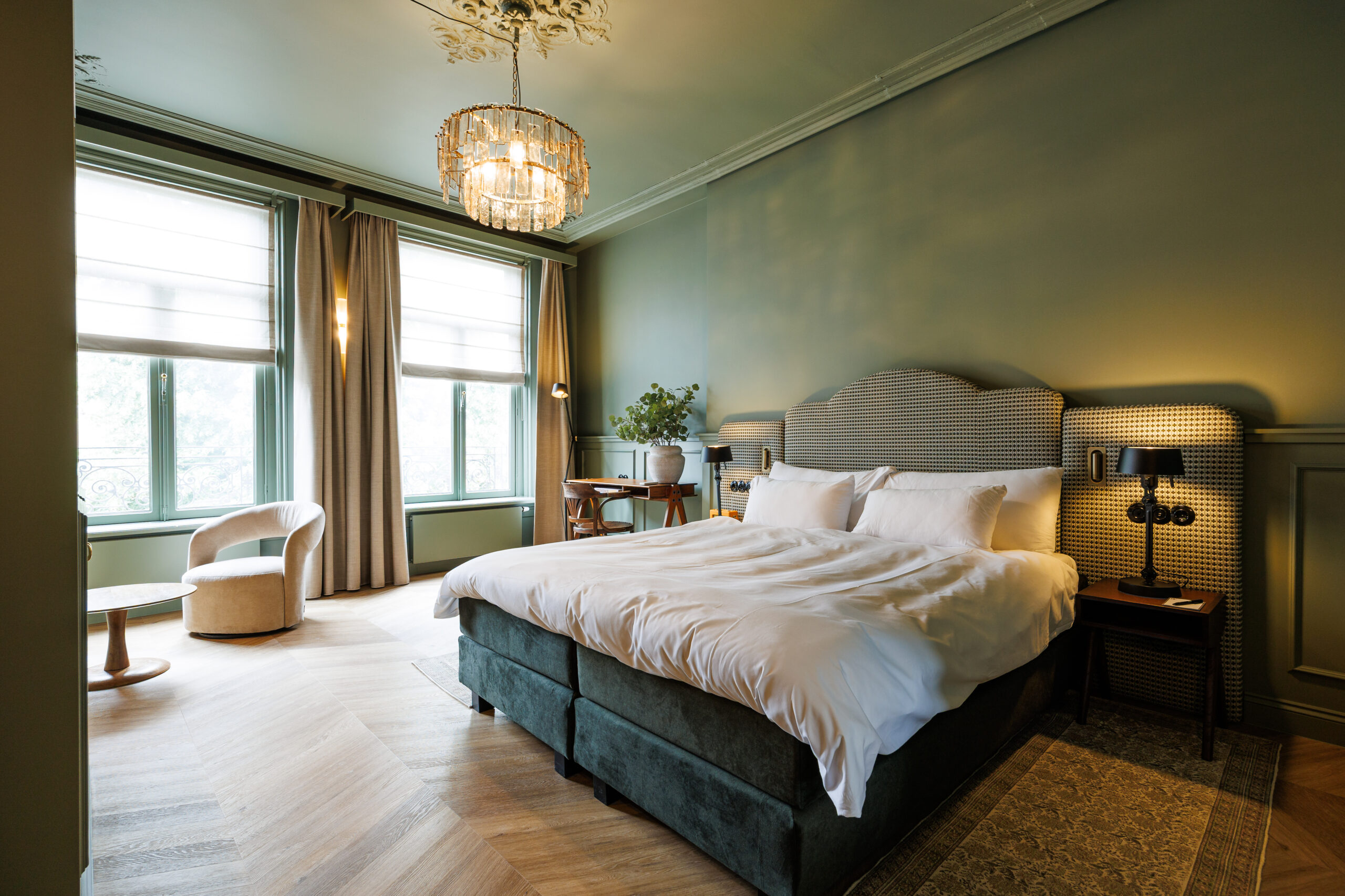 In een monumentaal pand uit het jaar 1880 is deze 30-35 m2 kamer onlangs zorgvuldig ontworpen en verbouwd in een Engelse / klassieke stijl met moderne twist. De kamer is gelegen op de tweede verdieping en heeft uitzicht over de Postelstraat.